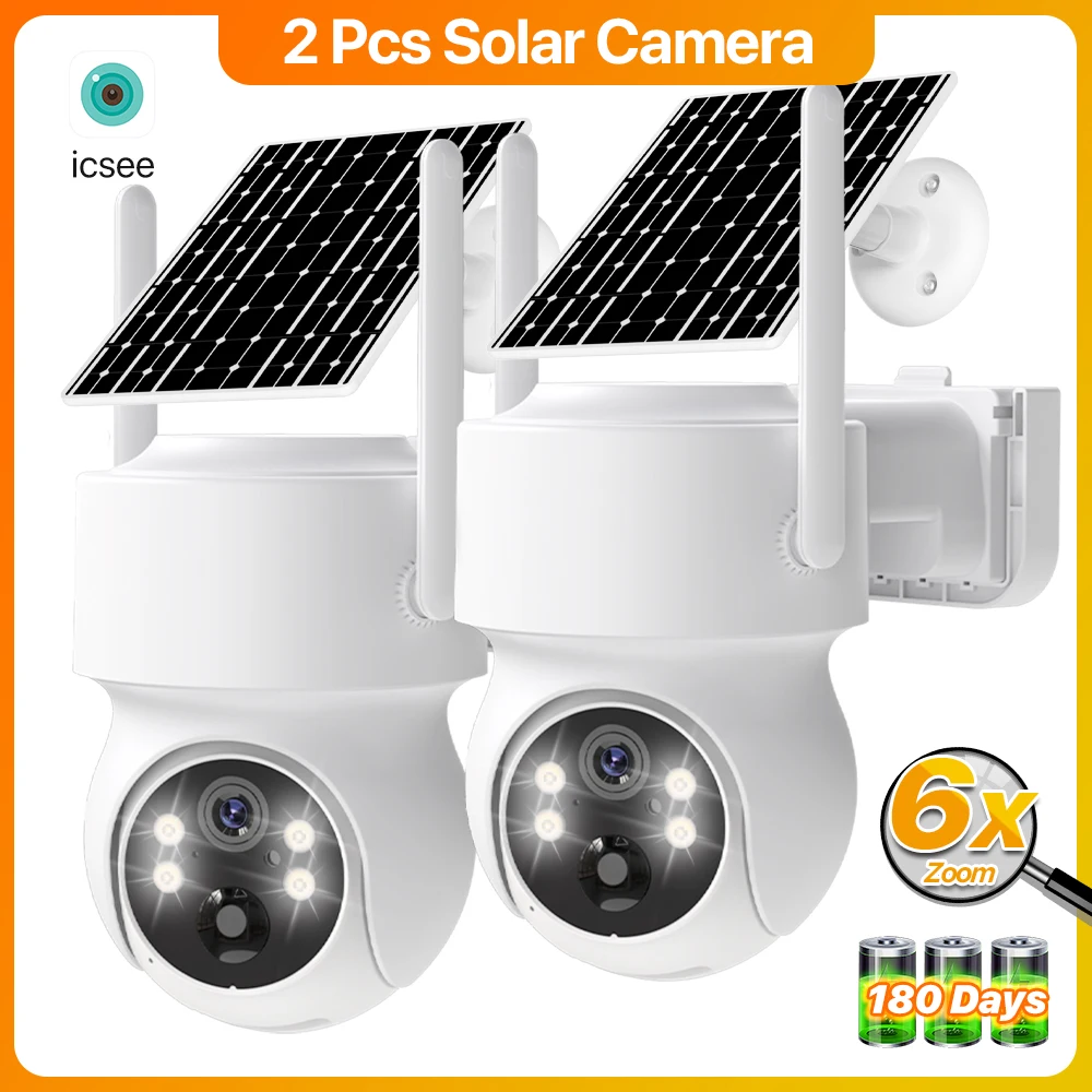 2 Pcs Wireless Solar IP Camera 4MP Outdoor Built-in Battery WiFi PTZ Camera 6X Zoom Video Surveillance Camera Long Time Standby