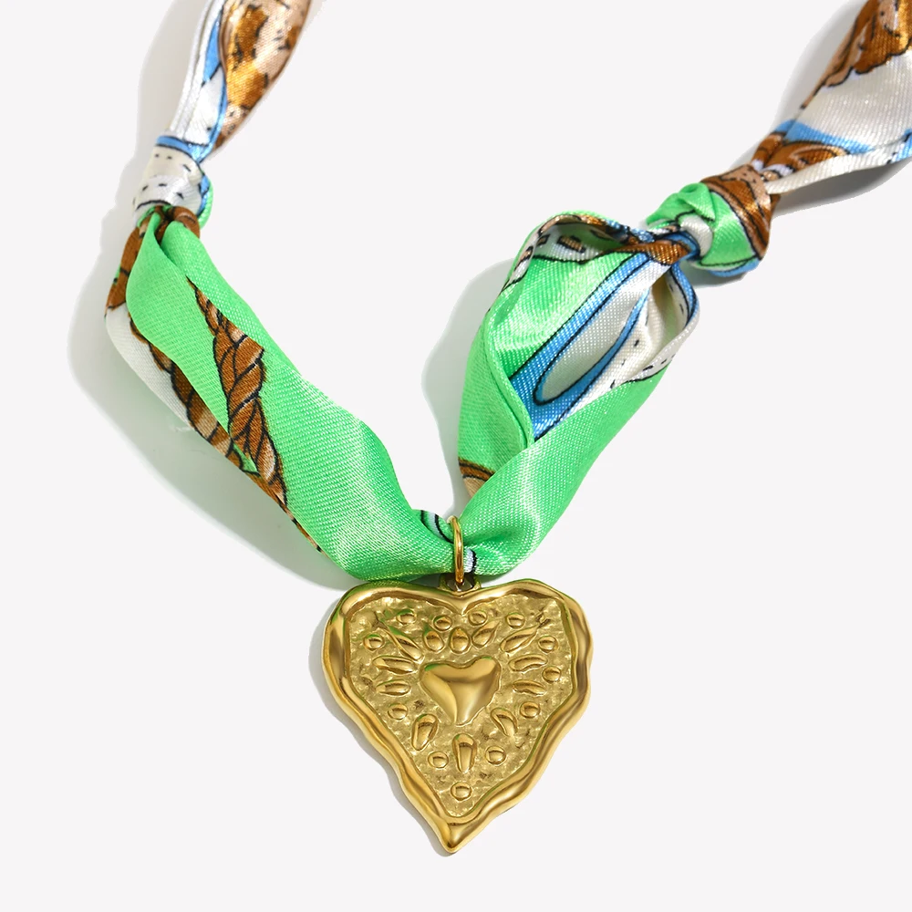 E.B.belle Stainless Steel Oil-pressed Heart Green Silk Scarf Necklace Retro Style Pendant For Women's Gift Birthday Party