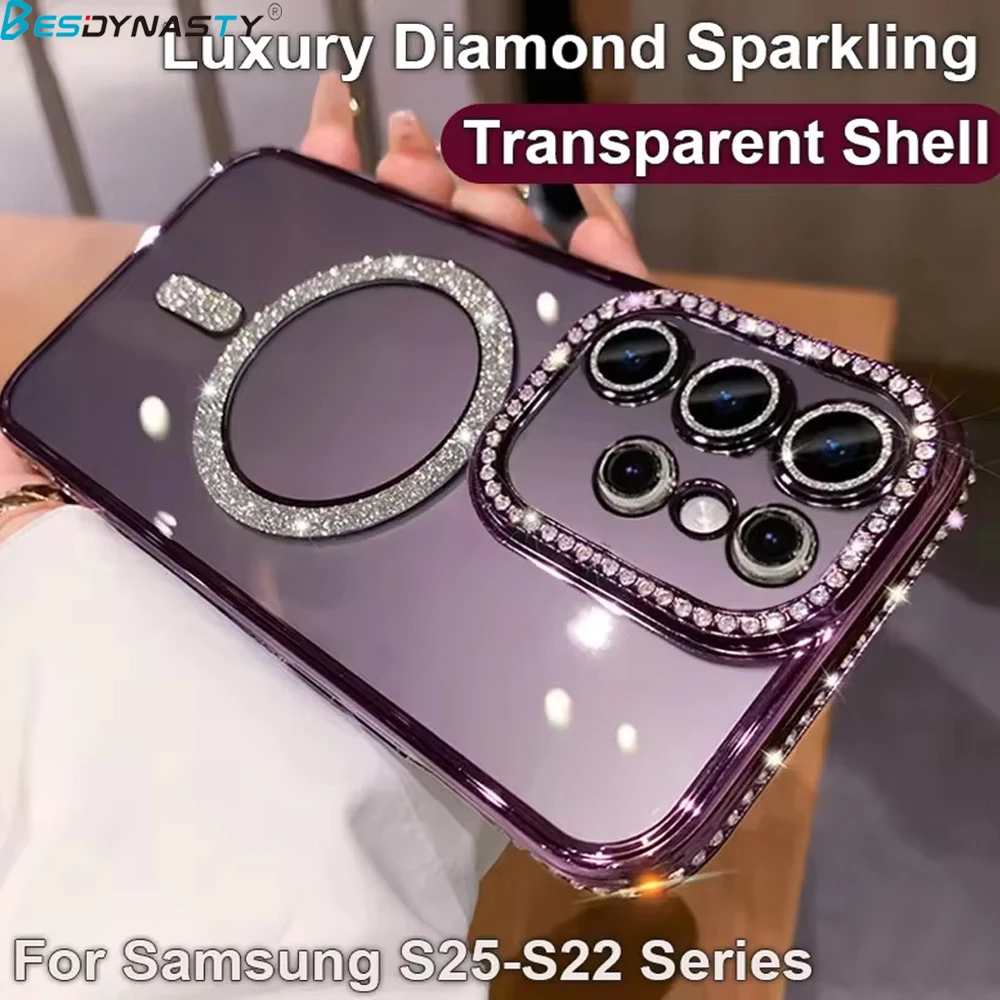 Luxury Plating Diamond Glitter Clear Case For Samsung Galaxy S25 S24 Plus S23 S22 Ultra Magsafe Magnetic Wireless ChargingCover