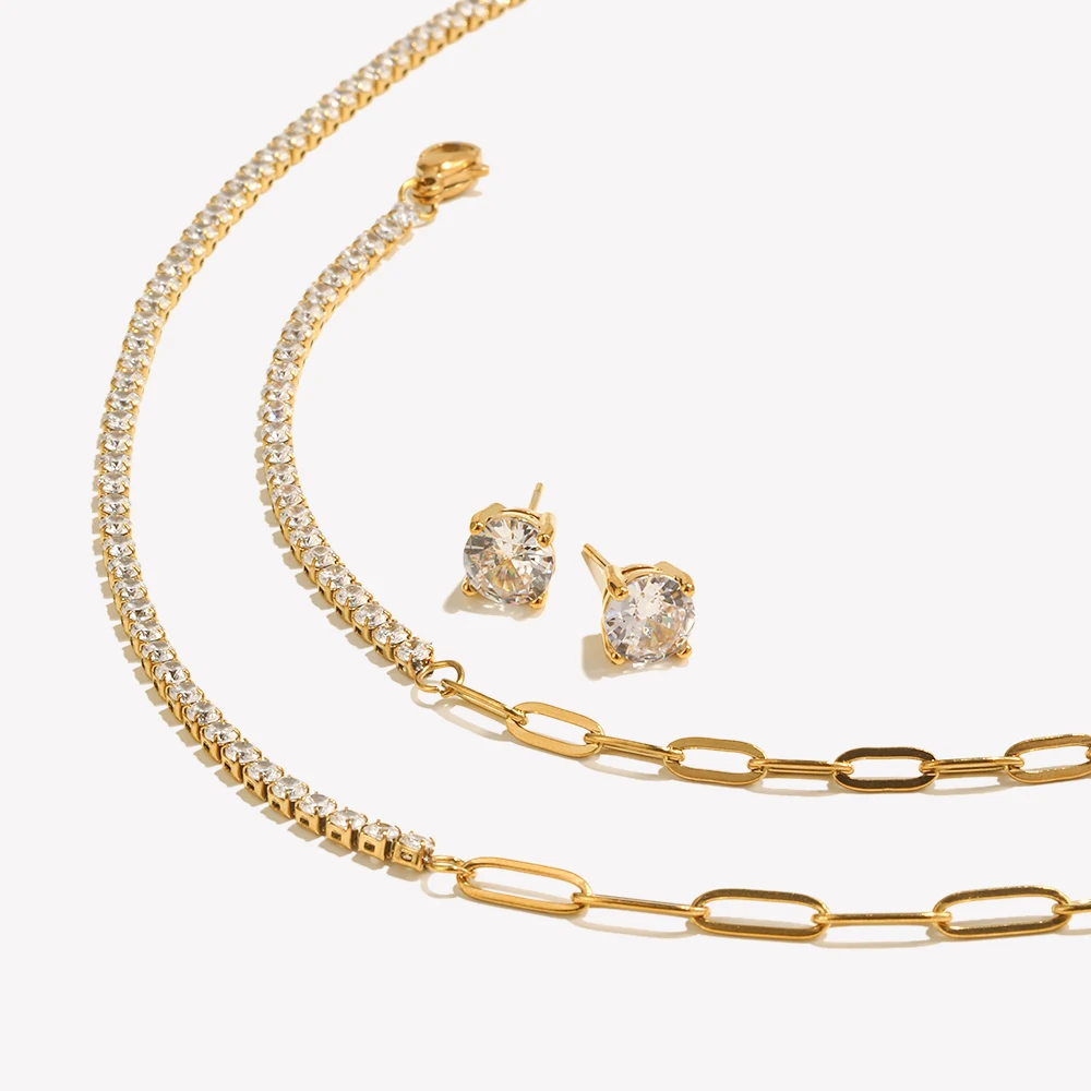 E.B.belle Zircon Chain Splicing Paper Clip Bracelet 18K Gold Plated Women's Earrings 316L Stainless Steel Accessories