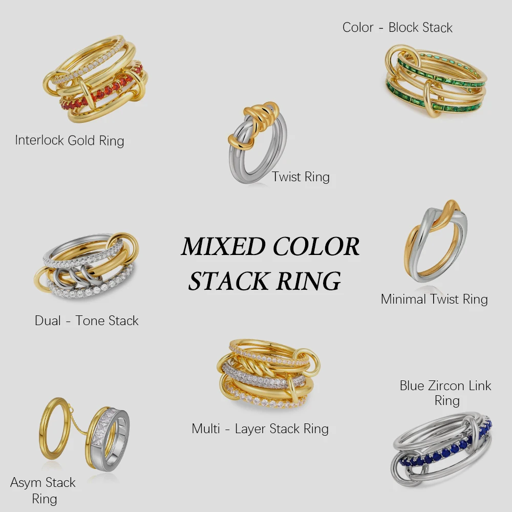 Stainless Steel Mixed Color Multilayer Connecting Rings Luxury Cubic Zirconia 18K Gold Plated Link Chain Stackable Jewelry Gift