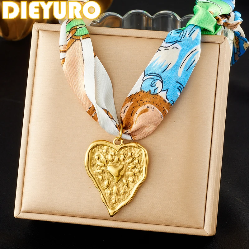 DIEYURO 316L Stainless Steel Golden Hammer Irregular Heart Pendant Necklace For Women Green Ribbon Chain Vacation Jewelry Gift