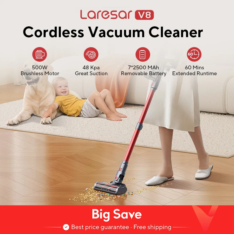 LARESAR V8 48Kpa 500W Cordless Vacuum Cleaner Car 60 Mins Home Appliance Wireless Removable Battery NEW Brushless motor
