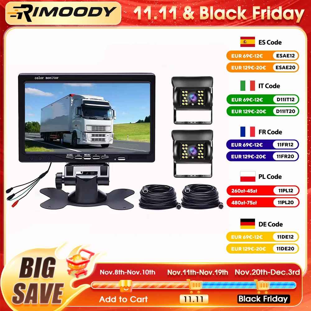 Rimoody 7" LCD Monitor 12V/24V Car Reverse Camera 4Pin Car Backup Rearview Monitor For Truck Bus Van Rear View Security Monitor
