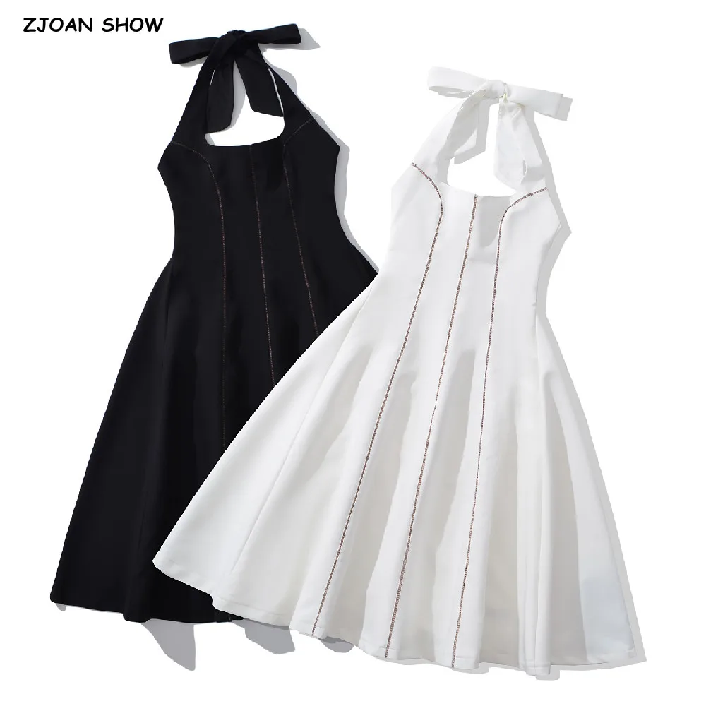 Sexy Tie Bow Halter Collar Sling Long Dress Women Spliced Hollow Out Hole Mesh Slim Waist Ball Gown Backless Dresses Party Robe