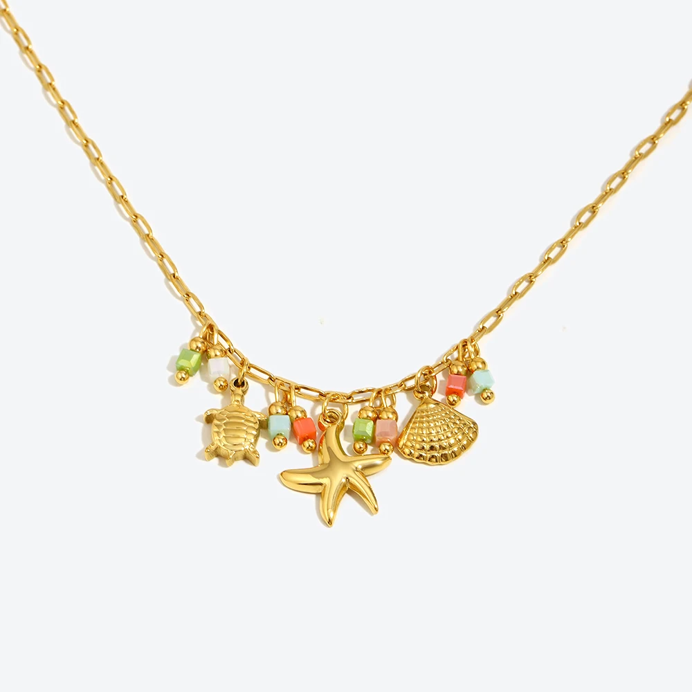 E.B.belle 18k Gold Plated Starfish Shell Sea Turtle Ocean Pendant Necklace Stainless Steel Waterproof Fashion Women Jewelry