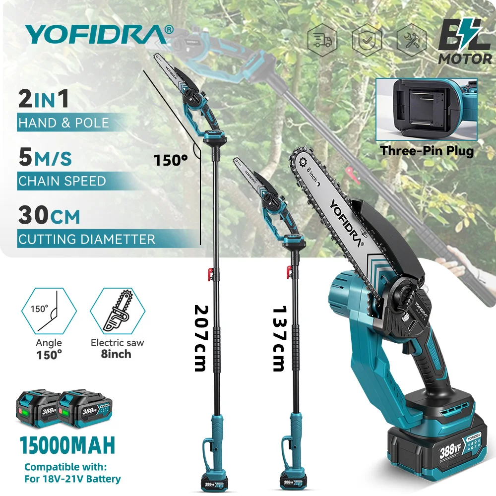 YOFIDRA 8Inch Brushless Telescoping Pole Electric Chainsaw 2 IN 1 High Branch Saw Pruning Power Tool For Makita 18V Battery Pin