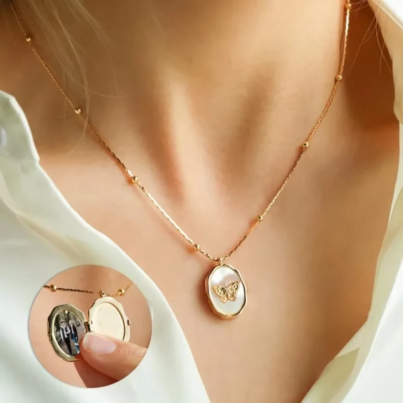 Custom Butterfly Shell Photo Locket Necklace for Women Vintage Frame Album Lockets Memorial Jewelry Mother's Day Gift Jewelry