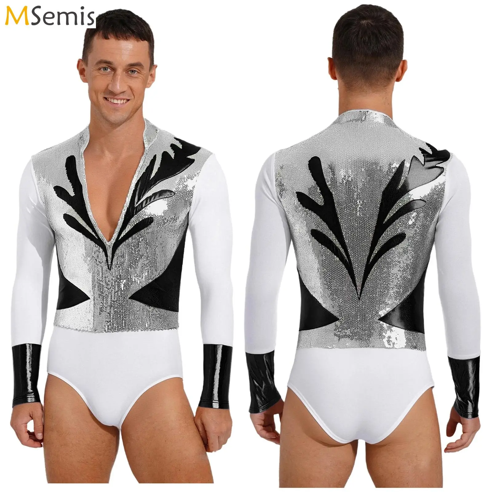 Mens Figure Skating Bodysuit Glittery Sequin Metallic Long Sleeve Leotard for Ballroom Ballet Latin Jazz Chacha Rumba Dancewear