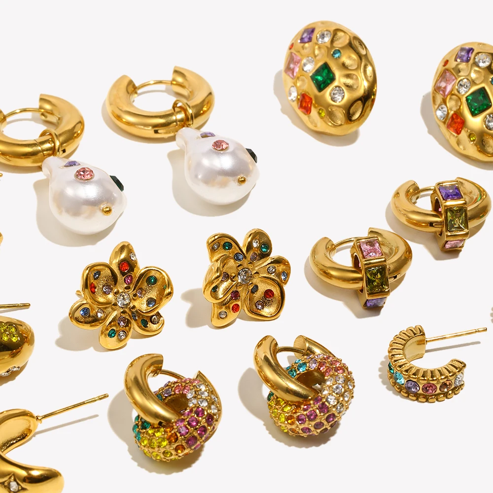 E.Bbelle Stainless Steel Colorful Zircon Hoop Earring Gold Plated Sweet Statement Tarnish Free Hypoallergenic Women's Jewelry
