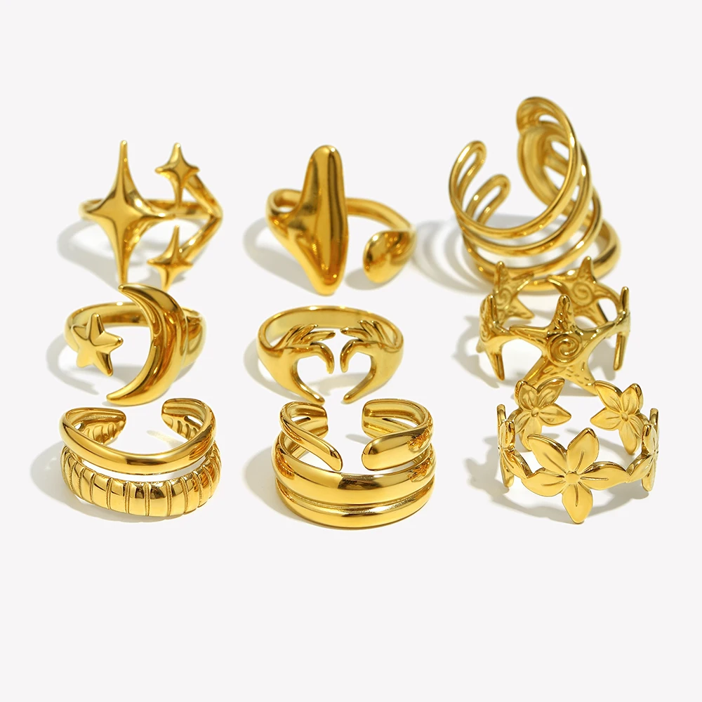 E.B.belle Stainless Steel Open Hollow Series Rings With Star Moon Spiral Pattern Tarnish Free Jewelry For Women's Gift Party