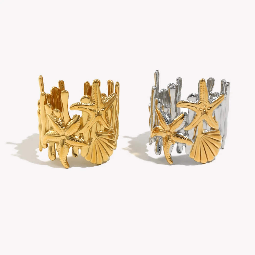E.B.belle Stainless Steel Shell Starfish Pattern Casting Ring With Long And Short Vertical Lines Gold Plated Jewelry Decoration