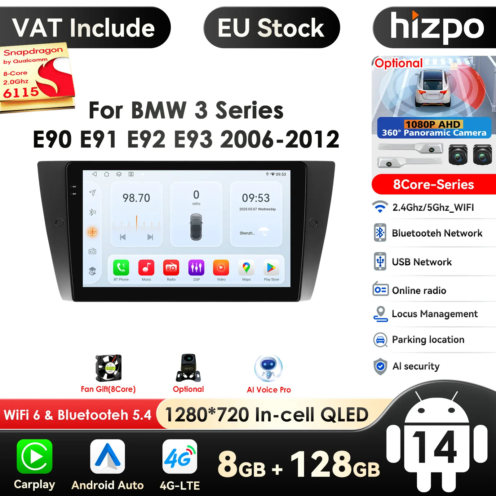 8G+128G Android Car Multimedia Player for BMW 3 Series E90 E91 E92 E93 2006-2012 GPS Navigation Stereo Audio Head Unit AutoRadio
