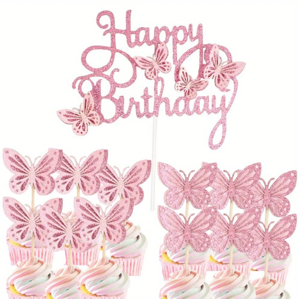 Pink Butterfly Cake Toppers 3D Butterfly Cupcake Topper for Girls Women's Happy Birthday Cake Topper Butterfly Birthday