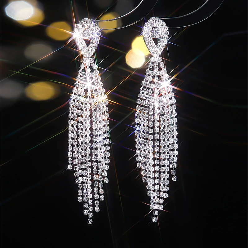 Fashion Hyperbole Crystal Dangle Clip on Earrings for Women Luxury Shiny Rhinestone Long Tassel Bridal Banquet Statement Jewelry