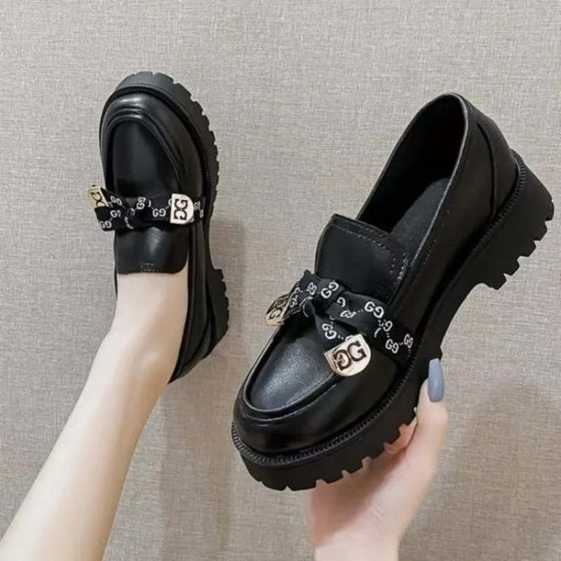 Women's Chunky Sole Loafers British Style Round Toe Flats Metallic Buckle Decor Soft Comfort Leather Shoes Fall Fashion Sl