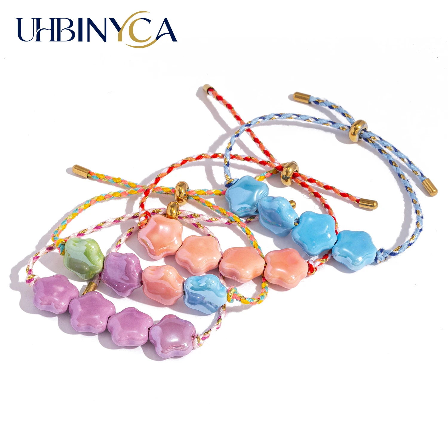 Adjustable Braided Rope Star Bracelet for Women-Colorful Ceramic Charms & Stainless Steel Clasp, Macaron Pastel Cute Jewelry