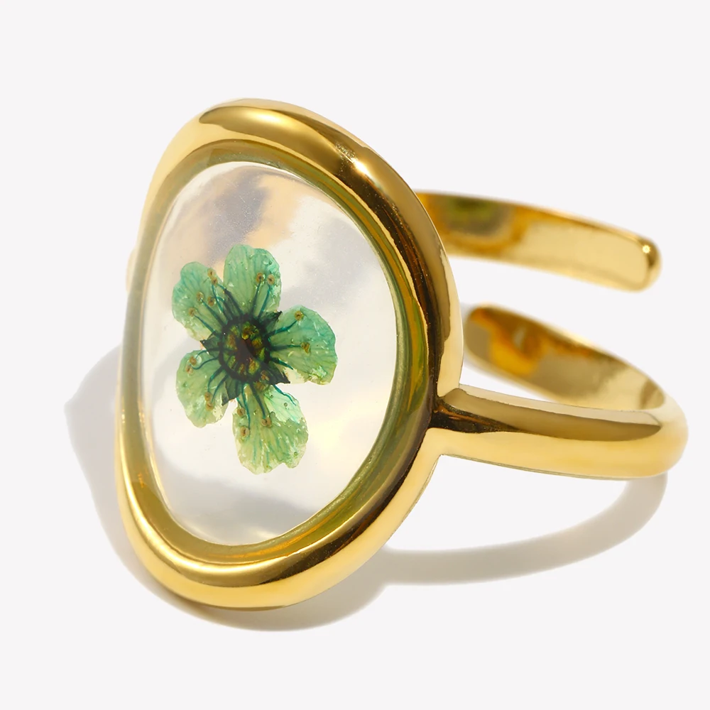 E.B.bellle Romantic Green Color Dried Flower Adjustabe Ring PVD Plated Stainless Steel Fashon Party Hypoallergenic Metal Jewelry