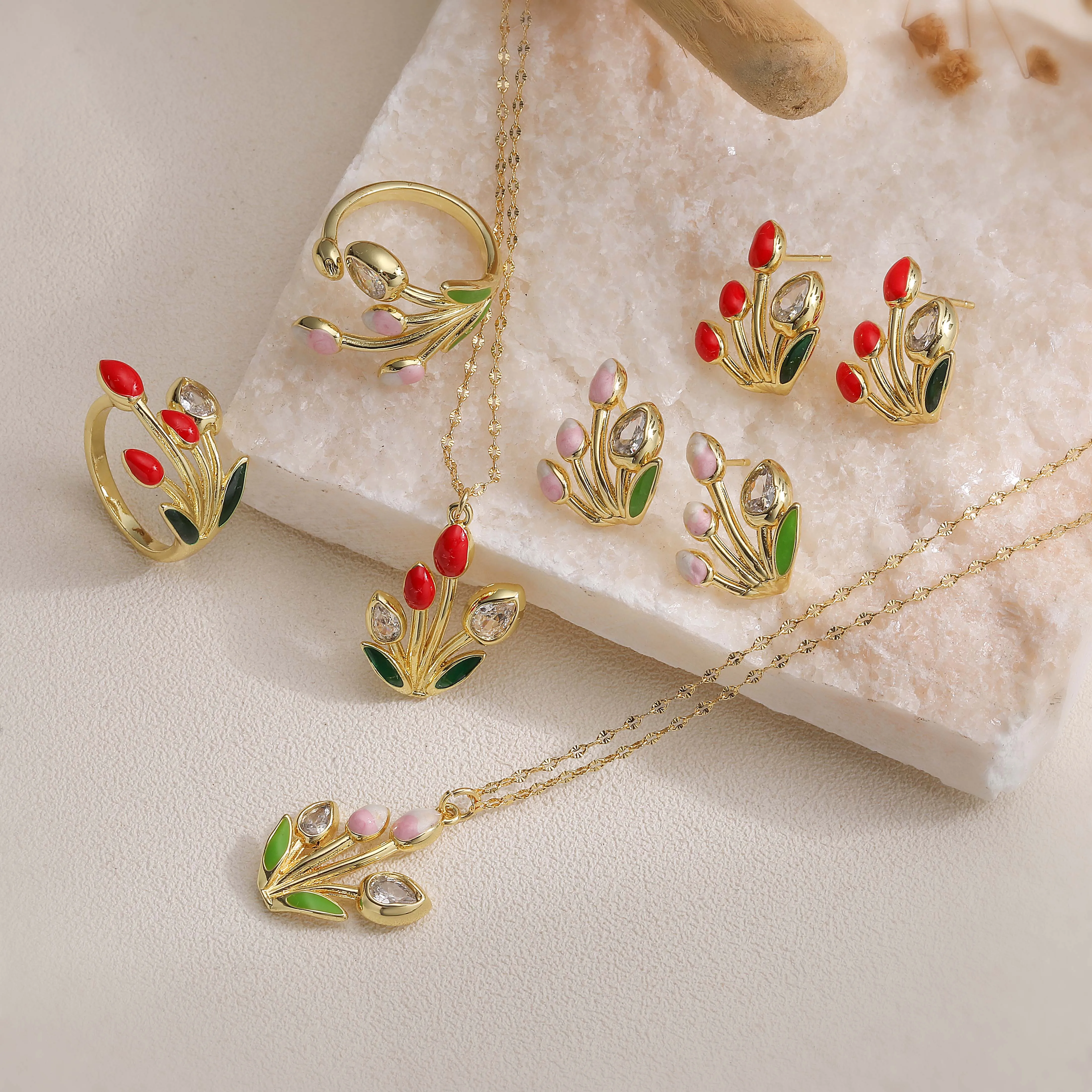 HECHENG, Enamel Glaze Pink/Red CZ Stone Tulip Flower Pendant Ring/Necklace/Earrings French Sweet and Romantic Jewelry 1 Piece