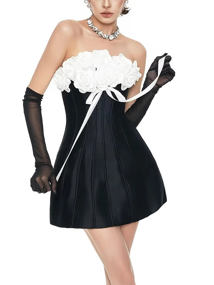 Sexy Strapless Flowers Patchwork Mini Dress Women Black Sleeveless Backless Lace-up Bow Floral A-line Dresses Evening Cocktail