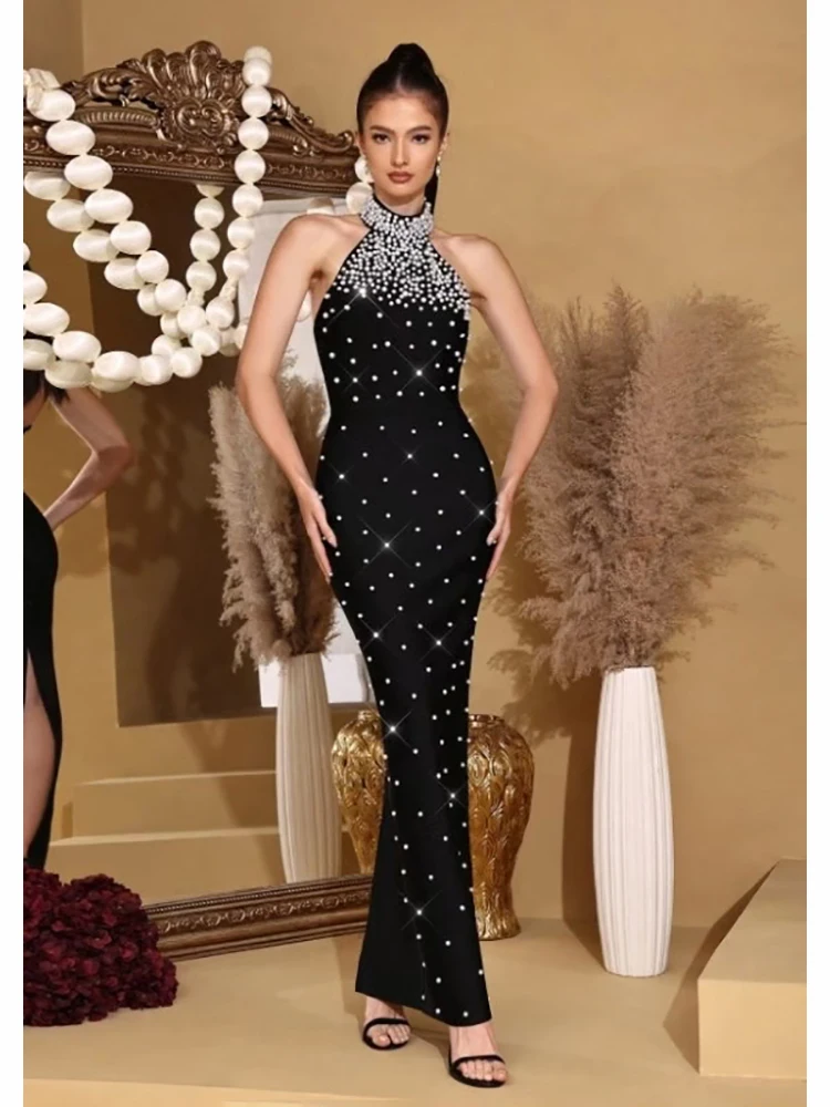 Sexy Halter Neck Pearl Beaded Bandage Dress Women Black Sleeveless Backless Luxury Beading Bodycon Dresses Evening Party Gowns