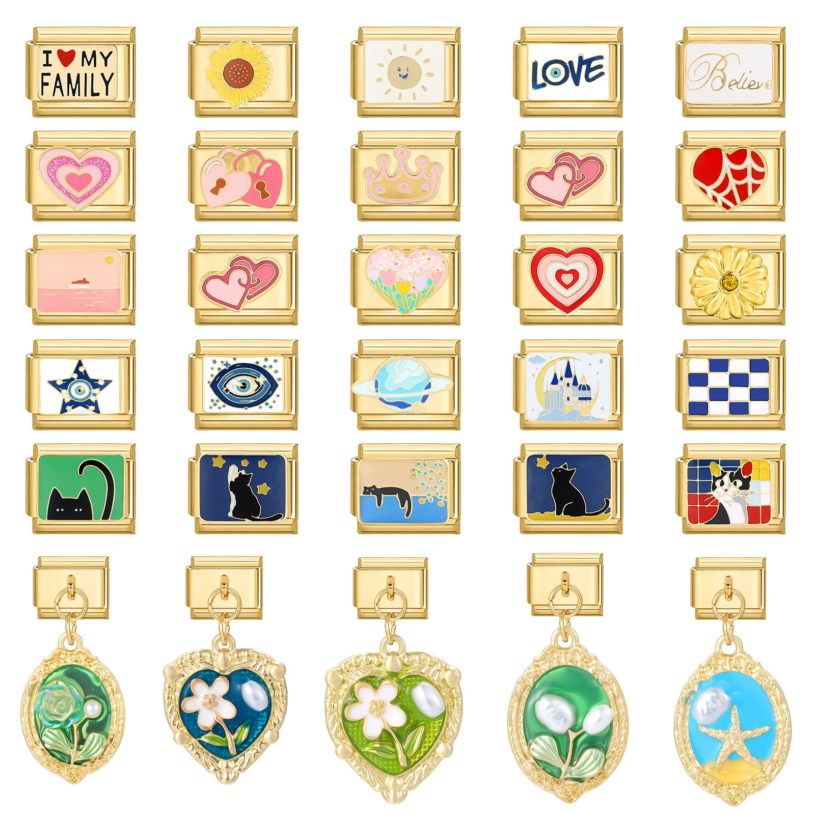 1PC Gold Color Flower Cute Cat Pendants Italian Charm Links Fit 9mm Bracelet Stainless Steel Men Women DIY Making Gifts
