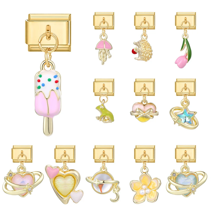 New Rabbit Heart Jellyfish Ice Cream Gold Color Pendant Italian Charm Link Fit 9mm Bracelet Fashion Stainless Steel DIY Making