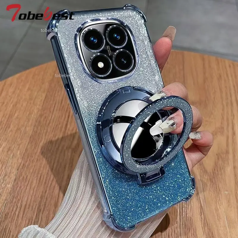Shockproof Glitter Silicone Case For Xiaomi Redmi Note 15 Pro Plus 4G 5G Mirror Magnetic Holder Stand Soft Cover