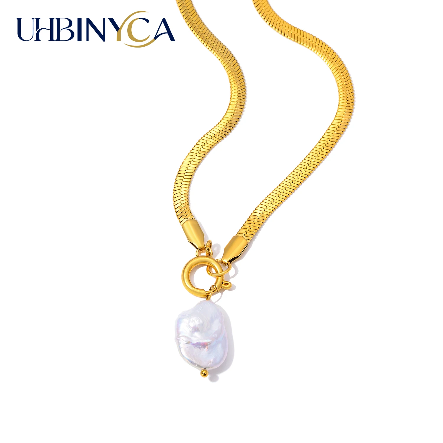 Baroque Pearl Pendant Necklace for Women Irregular Pearl with Flat Snake Chain 18K Gold Plated Stainless Steel Statement Jewelry