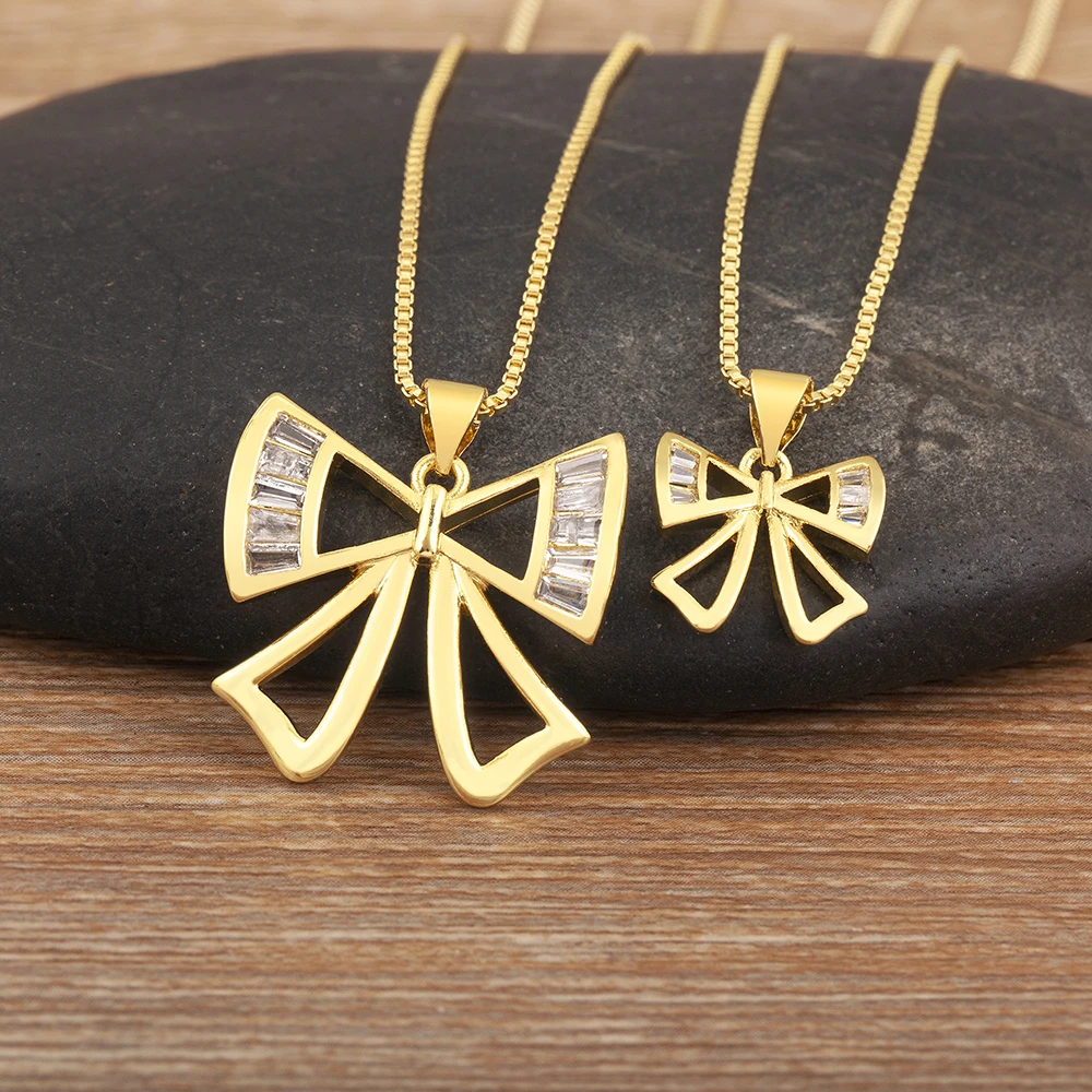 Nidin New Trendy Hollow Design Bow Knot Shape Charm Ribbon Pendant Necklace S/L Sizes Choice Copper Inlaid Zircon Jewelry Gifts