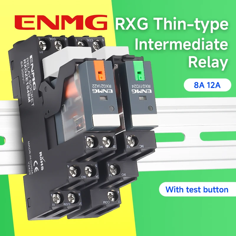 ENMG RXG Intermediate electromagnetic Relay Set 24VDC with LED 8-Pin 5-Pin 220VAC Plug-in Base Surge Protection 2NO 2NC DIN35mm