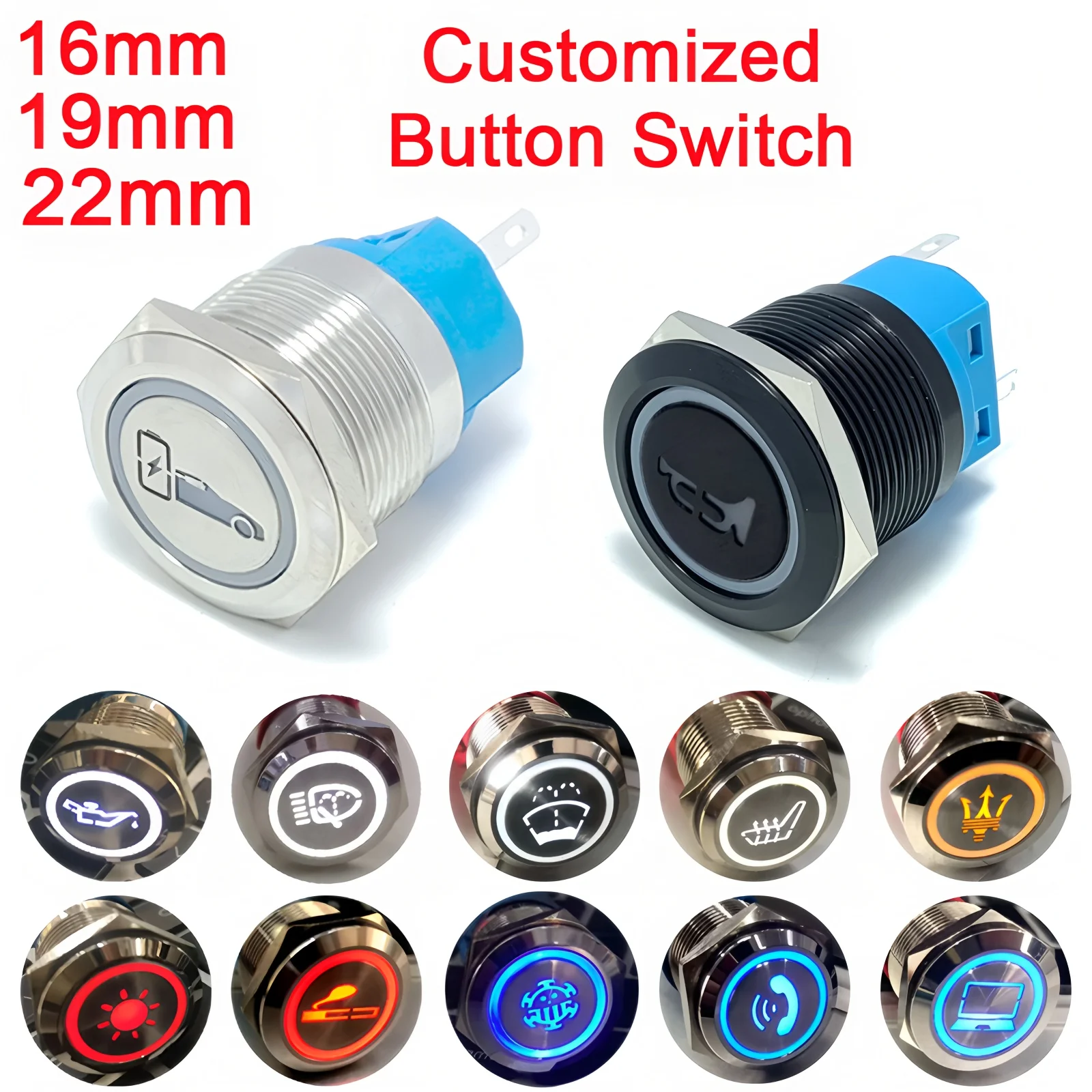 16/19/22MM Customized Metal Button Switch LED With Socket 12V 24V Black/Silver Waterproof Suitable for Cars, Ships, Motorcycles