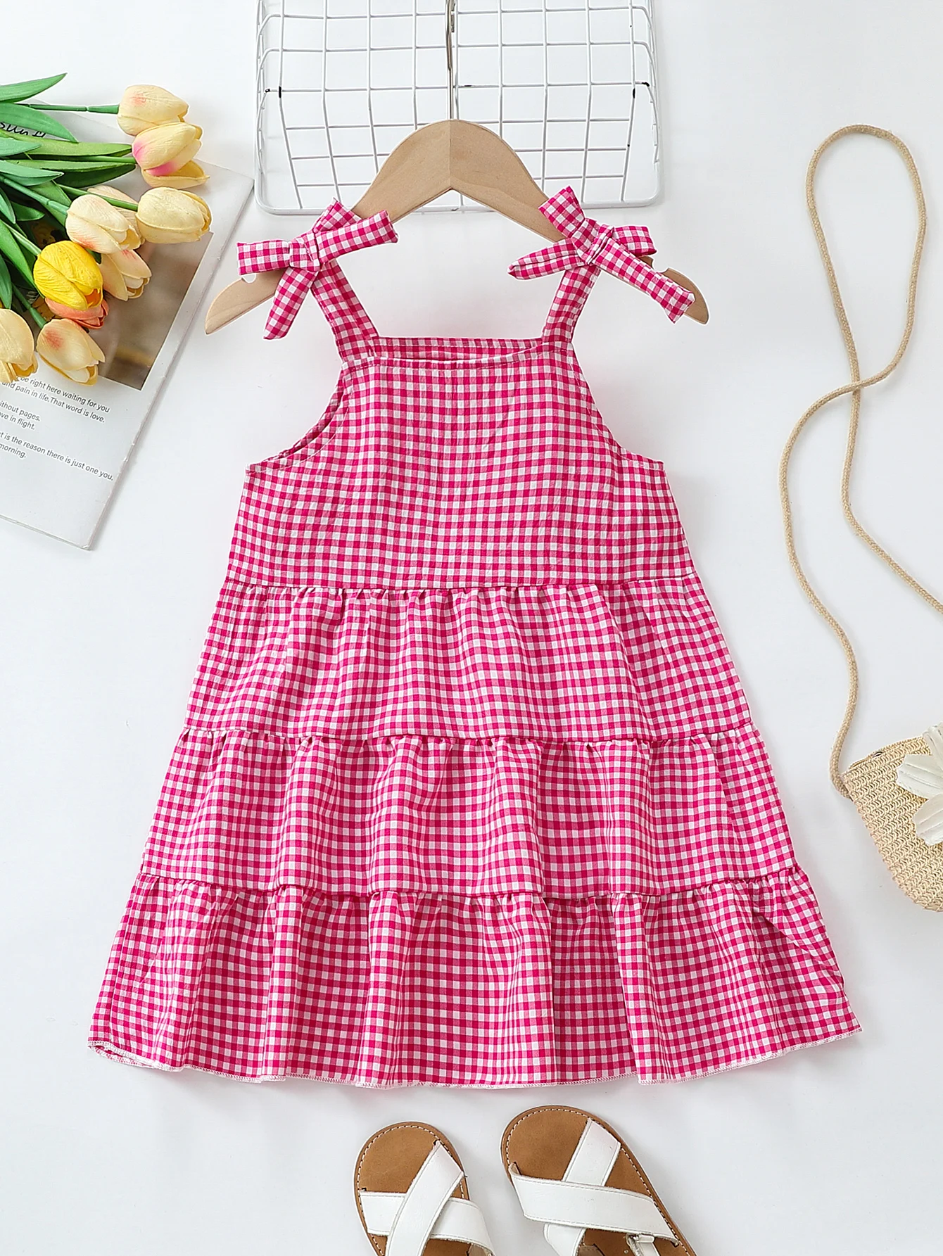 Top Rated Trending Baby Girl (0-4Y) Pink Gingham Tie-Strap Tiered Dress: Soft Breathable Cotton, Skin-Friendly & Lightweight,