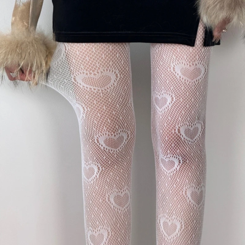 Woman Heart Flower Mesh Tights Japanese Girl Lolita Ins White Fishnet Pantyhose Summer Thin Breathable Hollowed Out Stockings